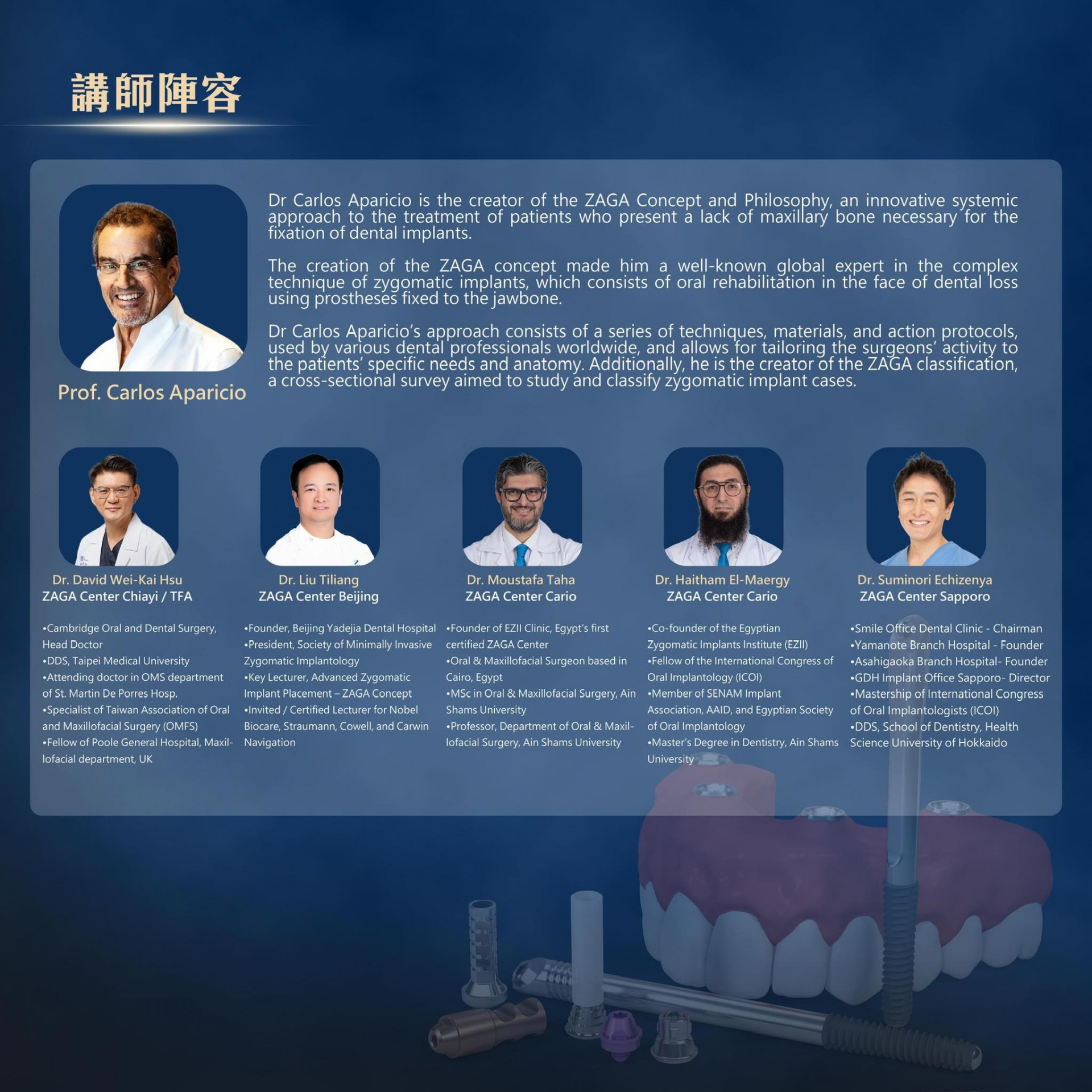 我們將完整呈現 ZAGA 的臨床思維與實務操作,透過國際講師的案例解析、臨床策略分享,以及 Hands-on 實作課程,讓與會醫師能夠深入理解顴骨植體與全口重建的核心原則,並將理論落實於臨床操作之中。